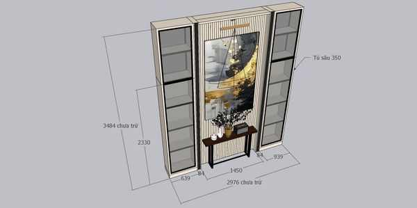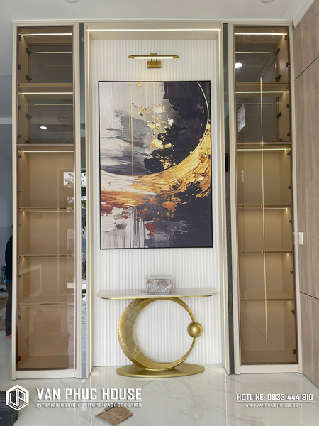 Trung tâm là mảng tường ốp nan dọc hiện đại, kết hợp tranh trang trí nghệ thuật và bàn console tạo điểm nhấn đẳng cấp. Hai bên là hệ tủ kính khung nhôm Xingfa kết hợp với la inox đen sang trọng, tích hợp đèn LED âm giúp tăng chiều sâu không gian và tôn vinh các vật phẩm trưng bày. Tổng thể thiết kế mang lại phong cách hiện đại - tinh tế - cao cấp, đảm bảo sự cân đối, thẩm mỹ.