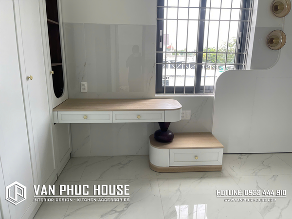 Với bố cục chữ L thông minh, toàn bộ khu vực được tận dụng tối đa nhưng vẫn giữ cảm giác thoáng đãng và sang trọng. Bàn làm việc chữ L giúp mở rộng diện tích sử dụng, thuận tiện cho học tập, làm việc và trang điểm. Hệ ngăn kéo ân, tay nắm tròn mang lạ sự gọn gàng và thẩm mỹ cao. Tủ treo kết hợp cánh kính vừa để trang trí vừa tăng chiều sâu cho không gian.