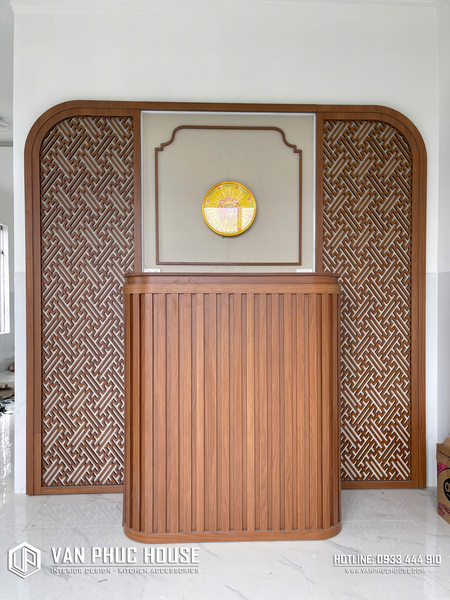 Không gian phòng thờ được thiết kế với vách gỗ CNC hoa văn truyền thống, kết hợp bo cong mềm mại tạo cảm giác trang nghiêm nhưng vẫn gần gũi. Mảng ốp trung tâm được xử lý tinh xảo, cân đối và chuẩn phong thủy.