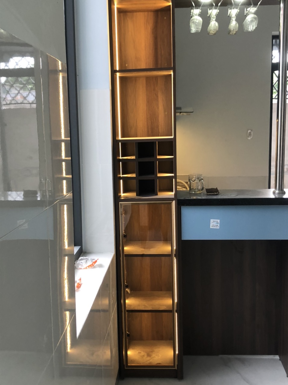 KHU VỰC KỆ- QUẦY BAR: Chất liệu MDF chống ẩm phủ melamin màu óc chó phối mặt hộc Acrylic, mặt bàn đá đen kim sa. Hệ đèn mắt cáo 3 chế độ sáng. Cánh kính cường lực 5mm hệ nhôm vàng xước 20*22, tay liền chữ U, kính màu trà.