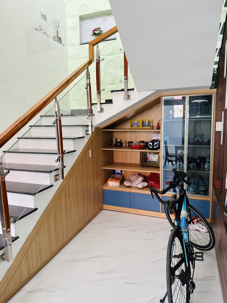 TỦ DƯỚI CHÂN CẦU THANG KẾT HỢP TỦ KỆ TRANG TRÍ: Chất liệu MDF chống ẩm phủ melamin màu sồi, chạy chỉ đồng sáng. Tủ kệ trang trí phối mặt hộc màu xanh, đi led âm 120b/m. Cánh kính cường lực 5mm hệ nhôm vàng xước 20*22, tay liền chữ U, kính màu xanh nước biển