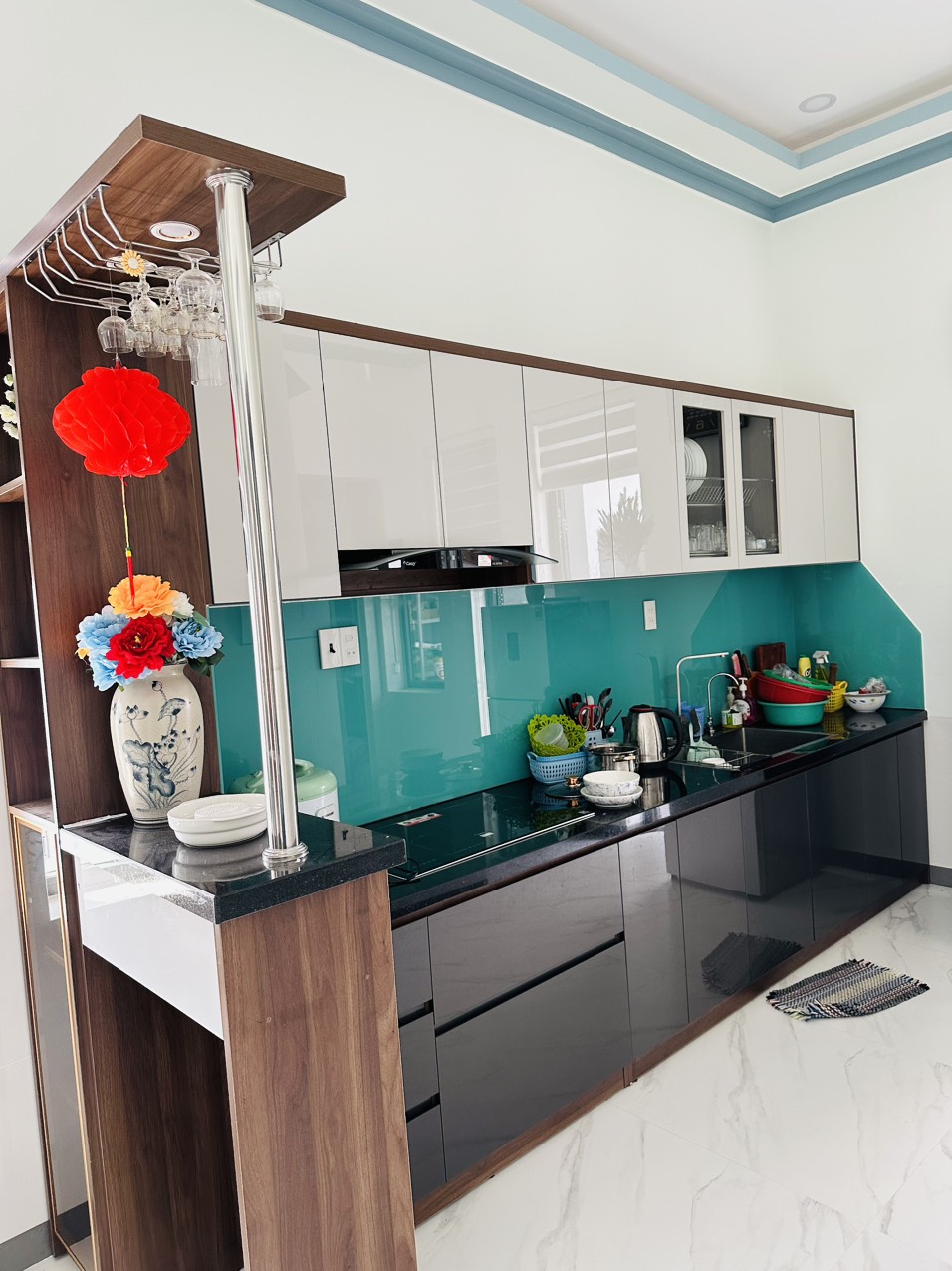 PHÒNG BẾP: Chất liệu MDF chống ẩm phủ melamin màu óc chó phối mặt hộc, ,mặt cánh Acrylic LiVas. Full phụ kiện hãng Eurogold, Hút mùi, bếp từ hãng Canzy. Mặt bếp đá đen kim sa giả dày, líp cạnh. Kính bếp cường lực dày 8mm sơn màu xanh ngọc hợp phong thuỷ gia chủ.