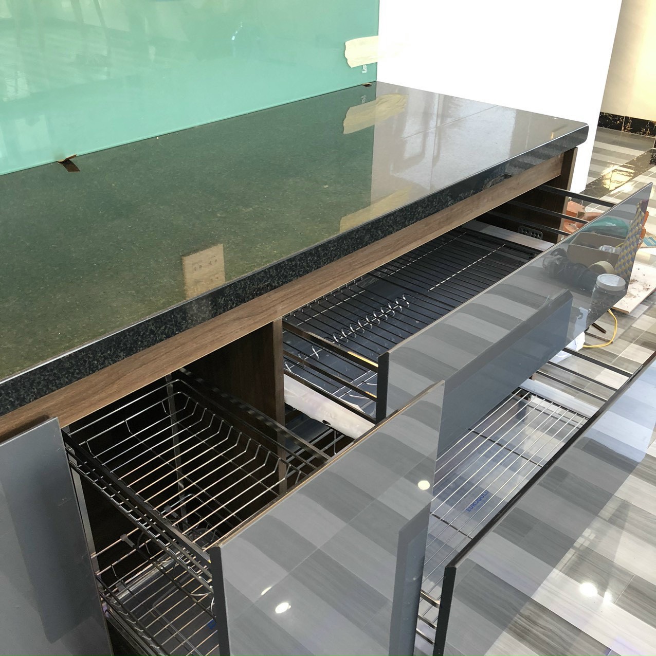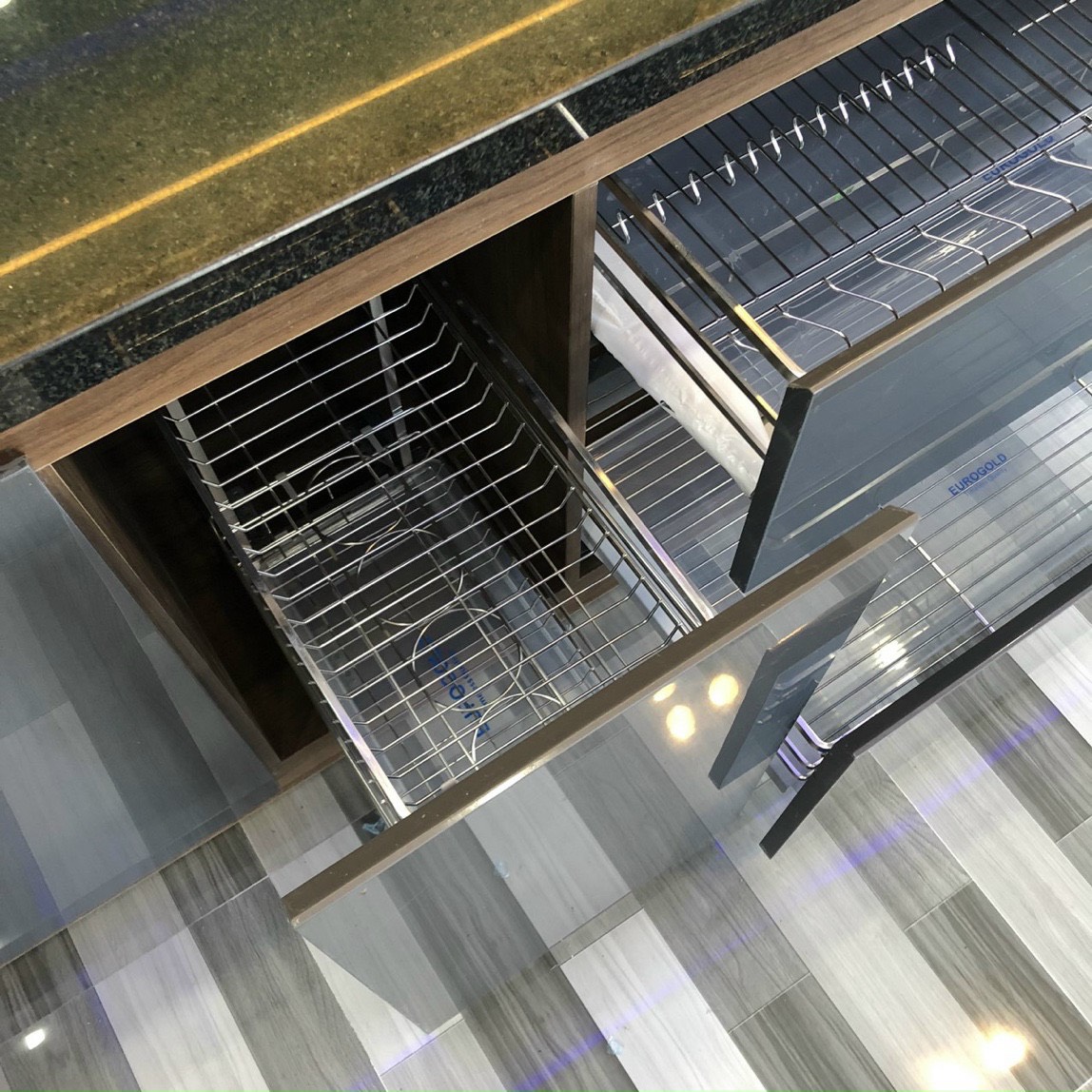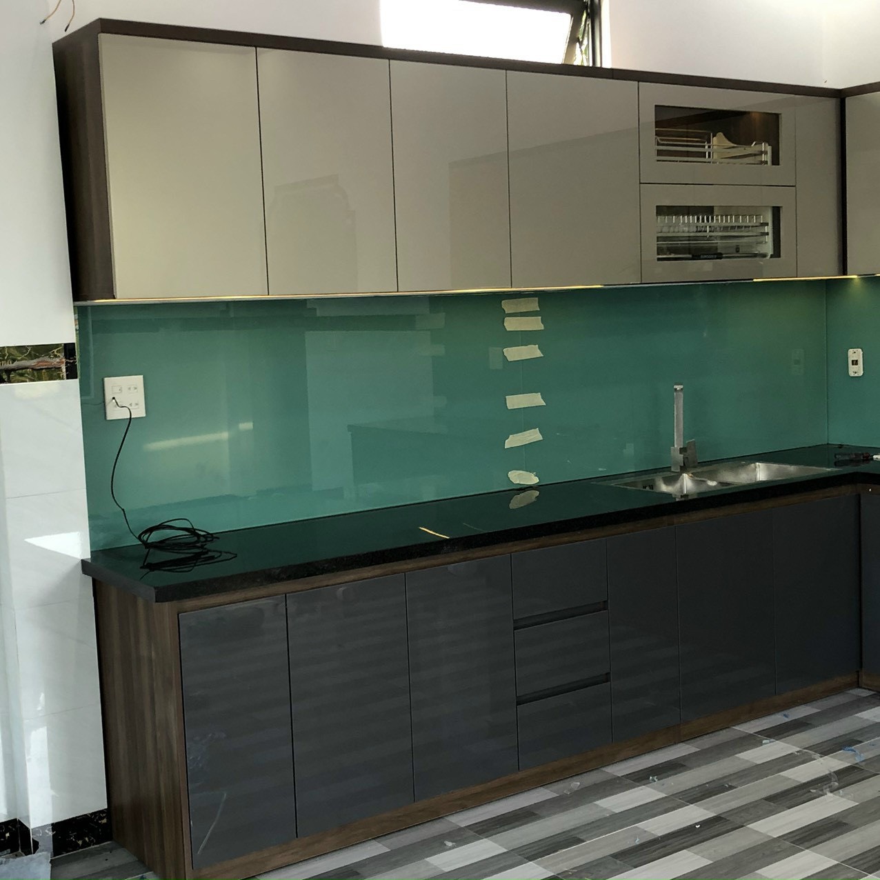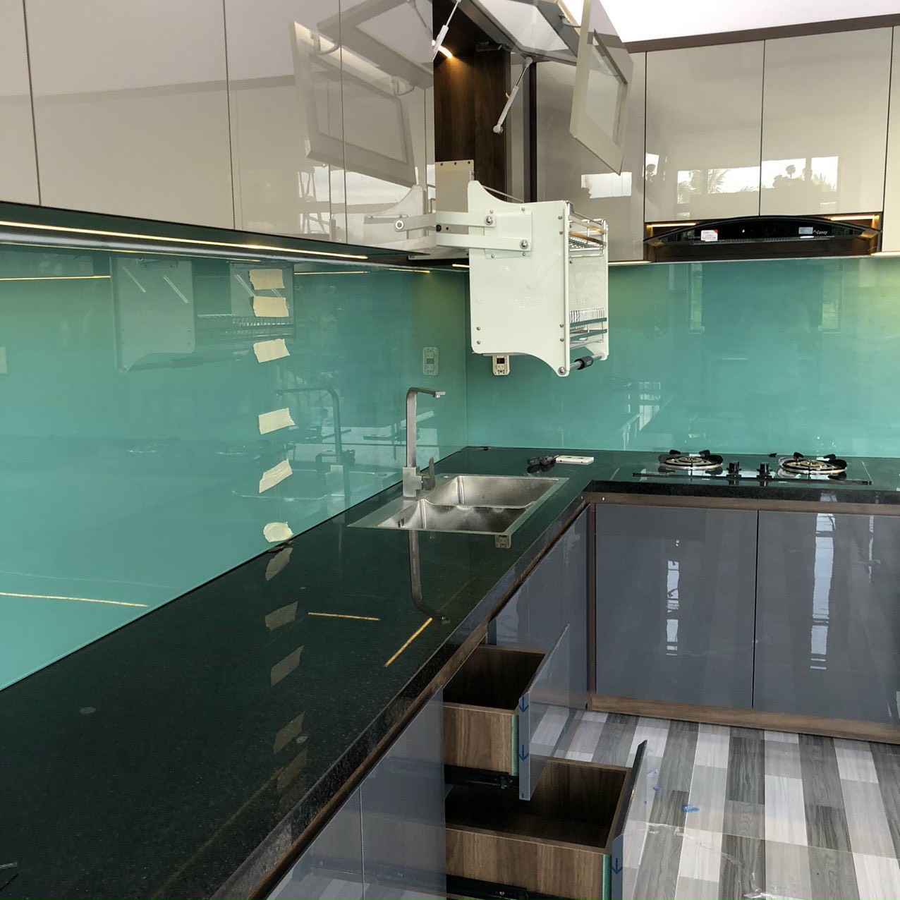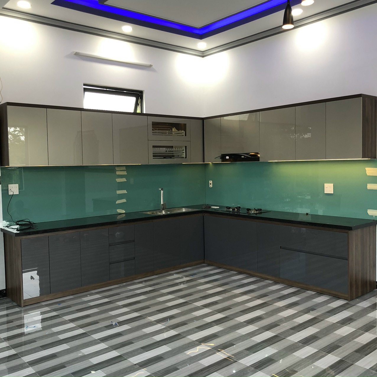 PHÒNG BẾP: Chất liệu MDF chống ẩm phủ melamin màu óc chó phối mặt hộc, ,mặt cánh Acrylic LiVas. Full phụ kiện hãng Eurogold, Hút mùi, bếp từ hãng Canzy. Mặt bếp đá đen kim sa giả dày, líp cạnh. Kính bếp cường lực dày 8mm sơn màu xanh ngọc hợp phong thuỷ gia chủ.