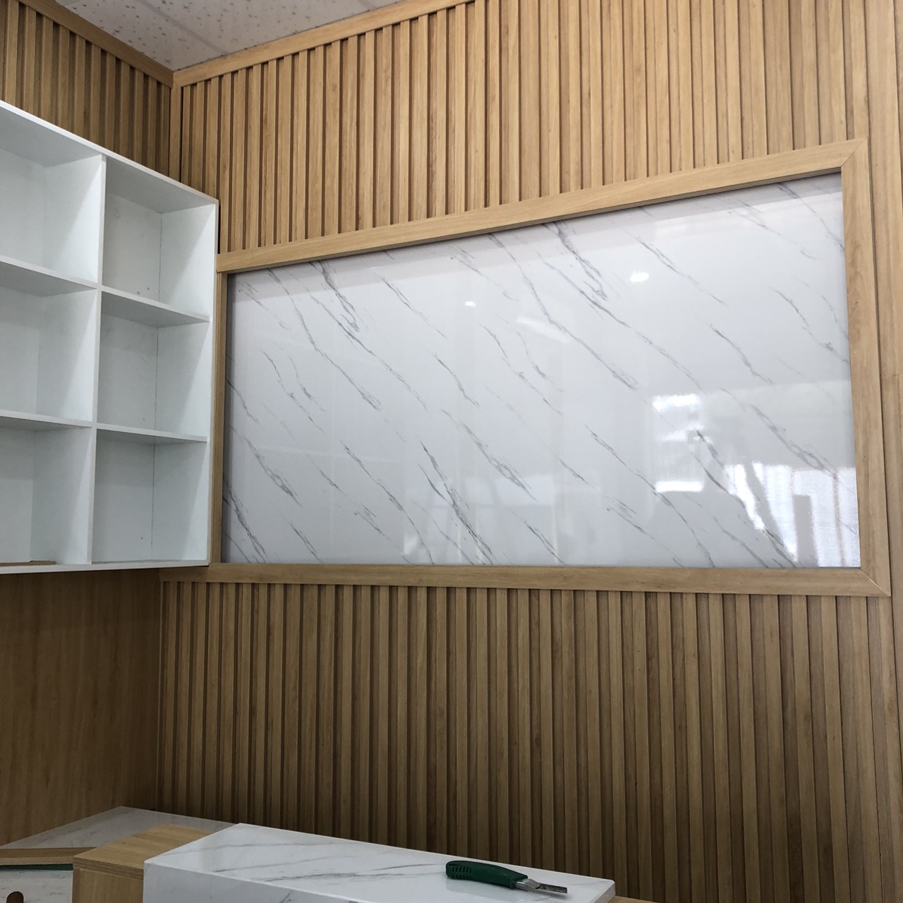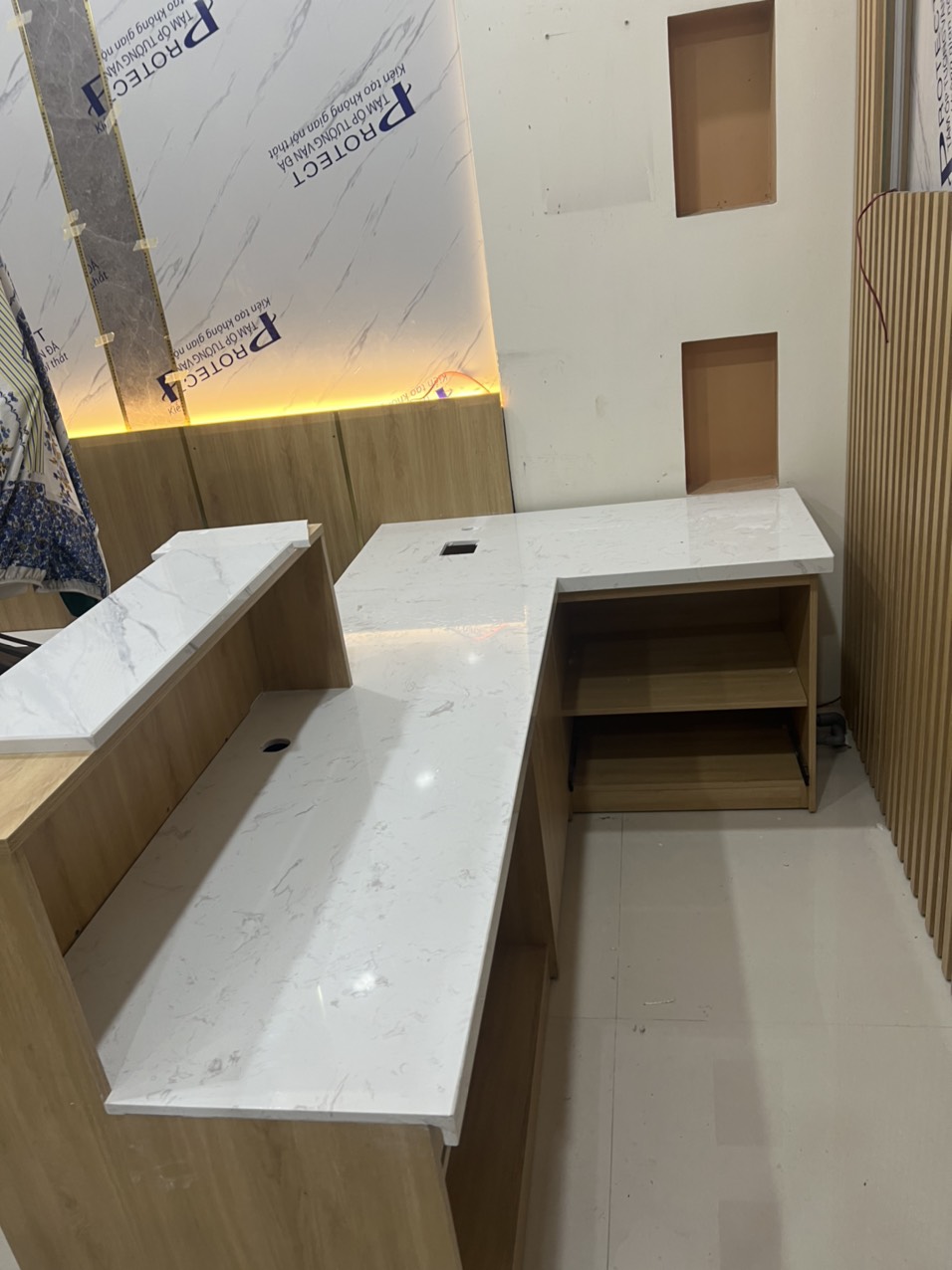 QUẦY LỄ TÂN - TỦ KỆ TRANG TRÍ - ỐP LAM TƯỜNG - ỐP PVC VÂN ĐÁ - CHỈ ĐỒNG