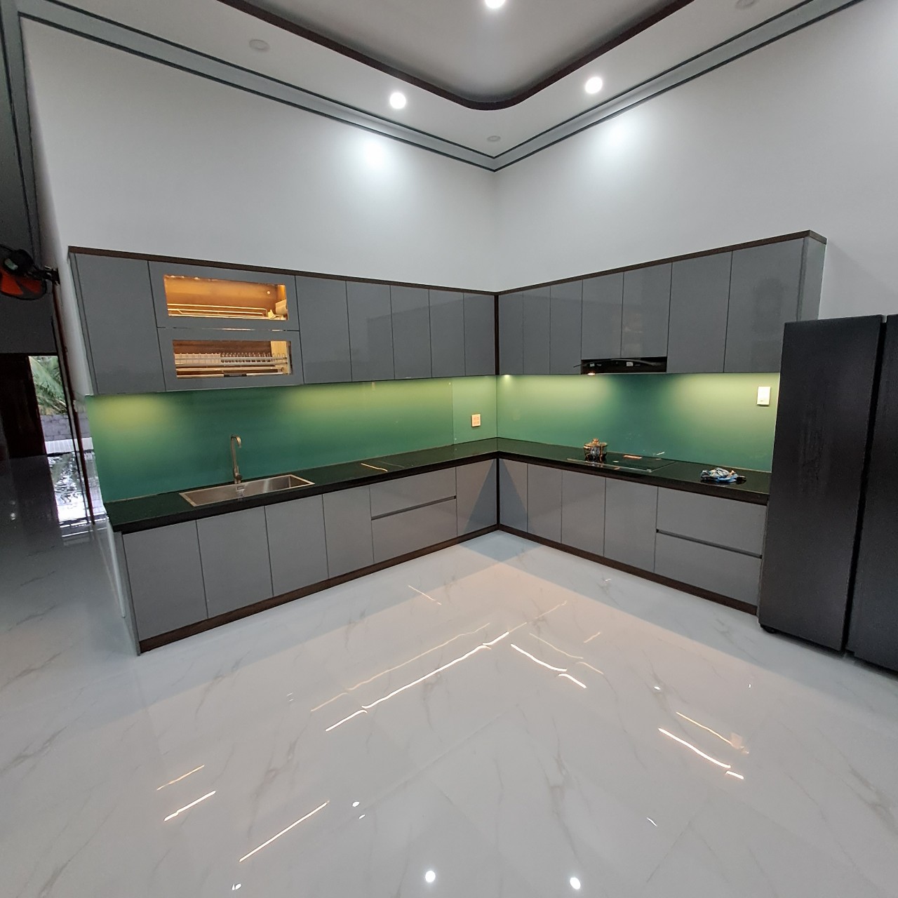 PHÒNG BẾP: Chất liệu MDF chống ẩm phủ melamin màu óc chó phối mặt hộc, ,mặt cánh Acrylic LiVas. Full phụ kiện hãng Eurogold, kệ chén nâng hạ két hợp tay nâng Blums hiện đại. Hút mùi, bếp từ hãng Canzy. Mặt bếp đá đen kim sa giả dày, líp cạnh. Kính bếp cường lực dày 8mm sơn màu xanh ngọc hợp phong thuỷ gia chủ.
