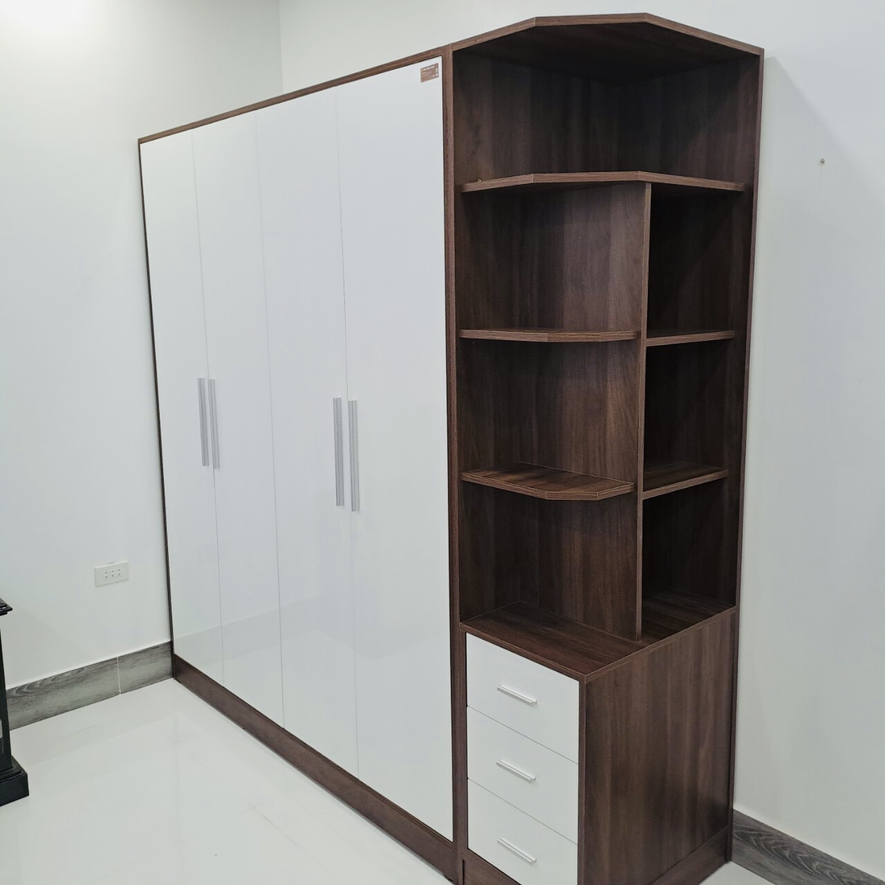 TỦ QUẦN ÁO: chất liệu MDF chống ẩm phủ melamin màu óc chó Phối mặt cánh màu trắng. Tay nắm nhôm bạc sang trọng
