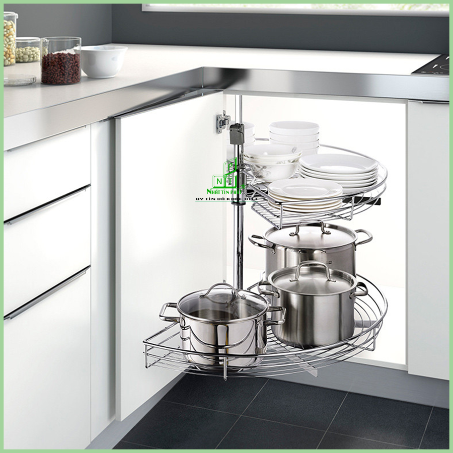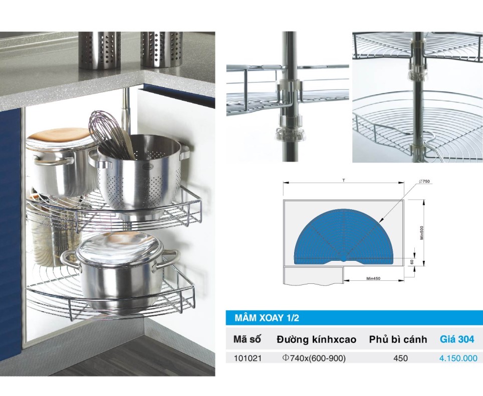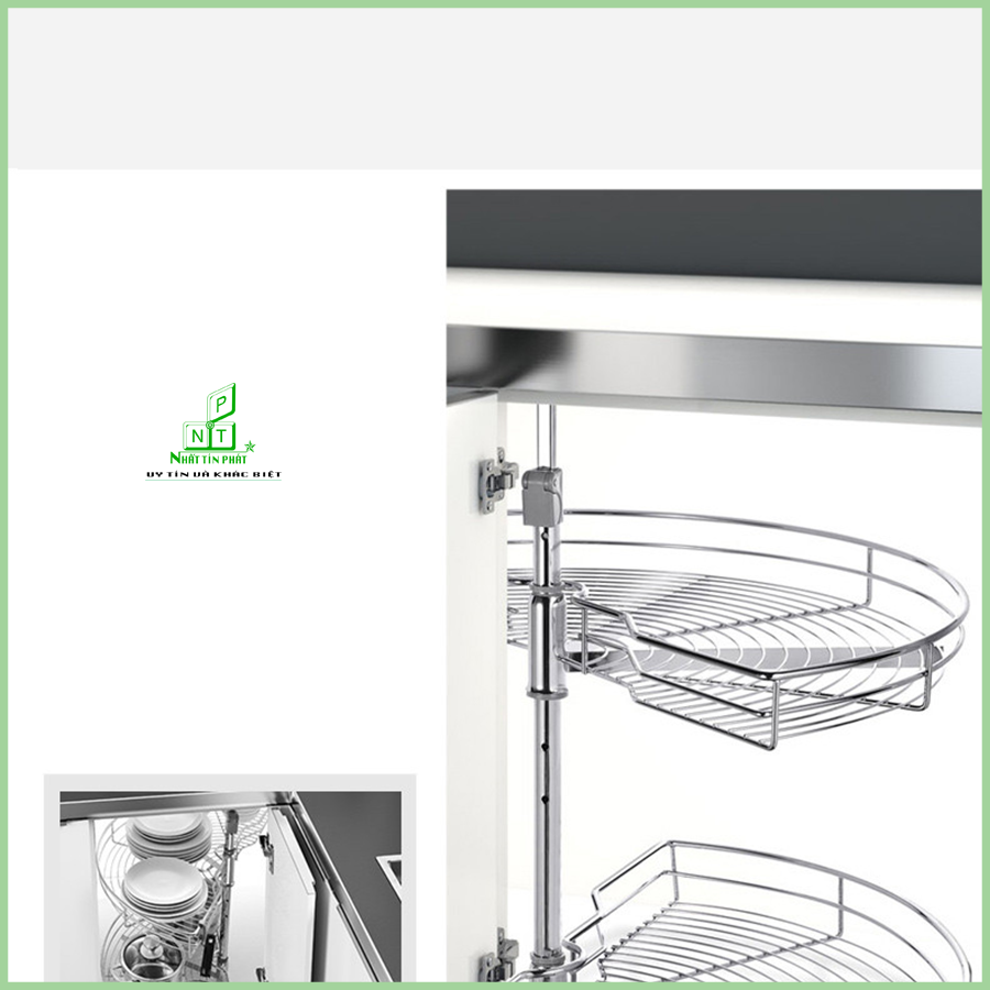Mâm xoay 1/2 inox 304 Higold có dạng hình bán cầu, 2 tầng gắn với 1 trục xoay linh hoạt. Đáy được thiết kế bằng nhiều thanh cong inox ghép lại tạo thành mặt phẳng đỡ xoong, nồi… giúp kệ không bị trữ nước, bụi bặm tiện lợi để cất giữ trực tiếp giúp thông thoáng và tận dụng góc khuất của tủ bếp.