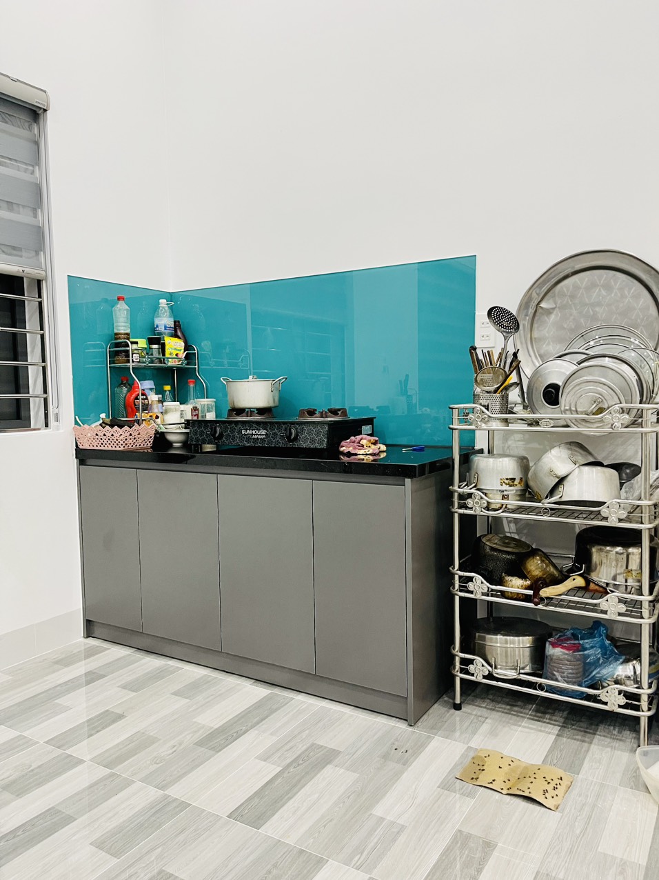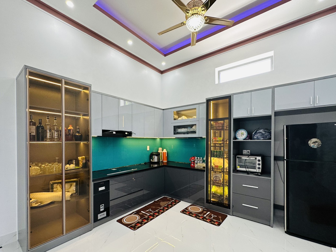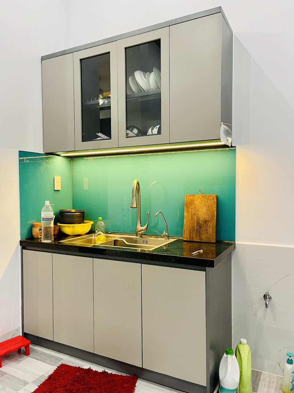 3. BẾP FULL PHỤ KIỆN: Thùng bếp gỗ MDF Mộc Phát. cánh tủ Acrylic. Kết hợp hệ tủ trang trí cánh kính với khung nhôm màu hồng baby độc đáo, sang trọng. Kính cường lực 5mm màu trà nhạt. Đèn led âm tủ. Bố trí phụ kiện hợp lý. Chuẩn căn bếp hiện đại