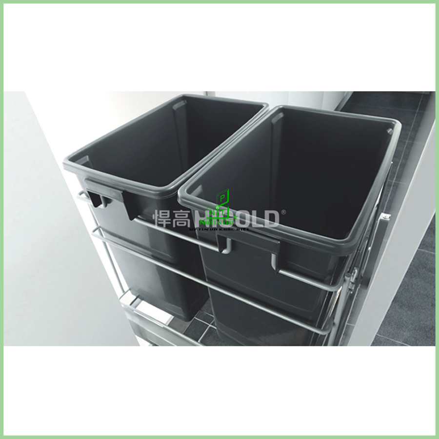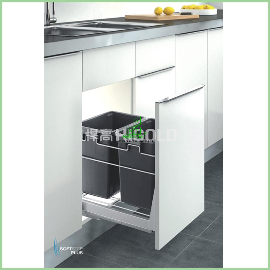 Thùng rác 2 ngăn: thiết kế âm tủ bếp, có bộ ray trượt giảm chấn giúp thao tác đóng mở nhẹ nhàng khi dùng đến thùng rác. Với thiết kế này bạn có thể tận dụng được khoảng trống dưới bồn rửa để lắp đặt nhằm tiết kiệm không gian bếp.